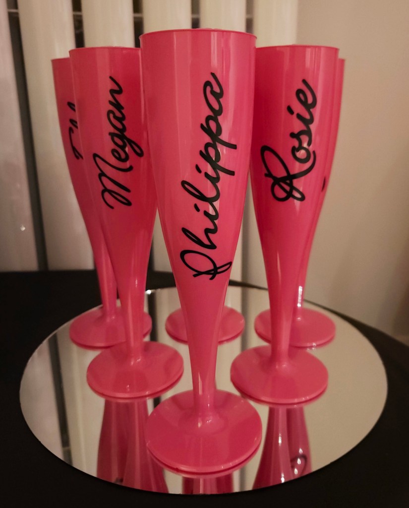 Our Personalised Pink and black Champagne Flutes are a lovely addition to any pamper or spa party. Not only can the children identify their own drinks easily during the party, but they also double up as great party gifts, especially when combined with