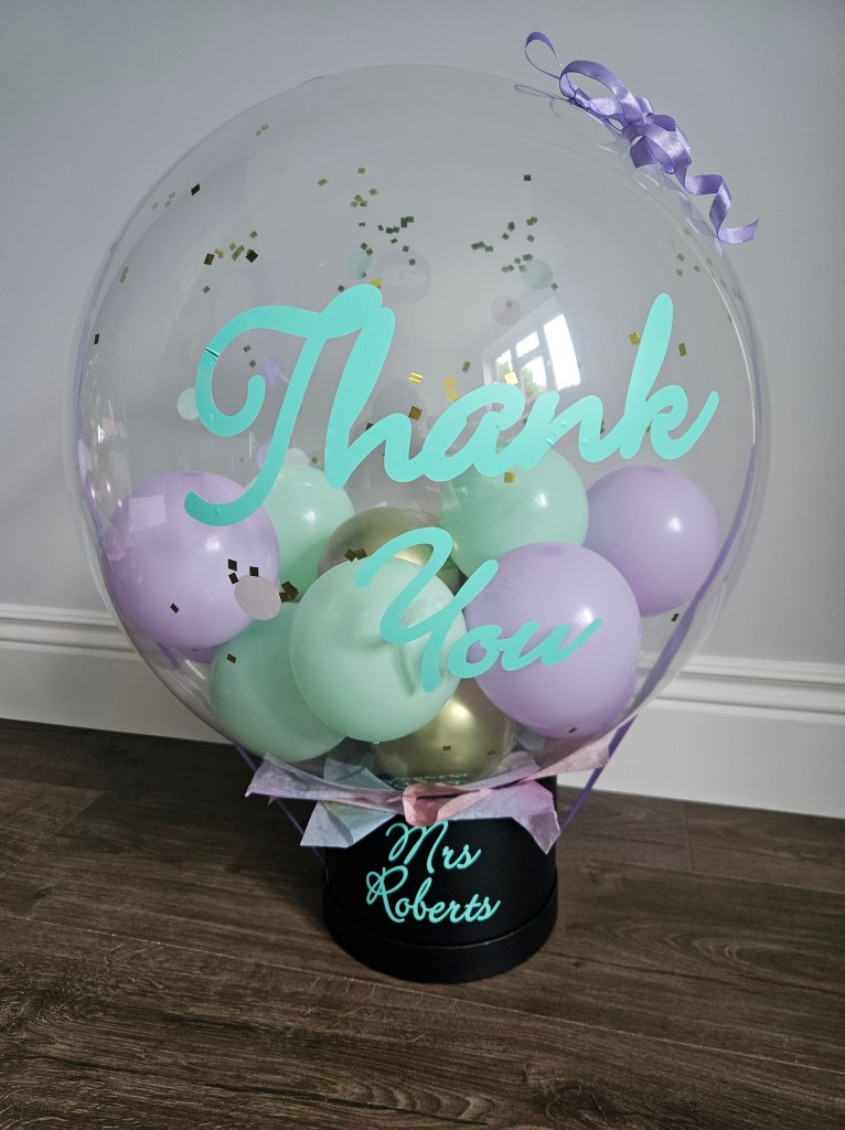 These bubble balloons make the perfect gift for a birthday, or a lovely thank you gift for bridesmaids, friends or even a teacher. They are stuffed with mini balloons and beautifully tied to a hat box, which can be filled with chocolates, tickets, vouchers, engagement rings or other small gifts.